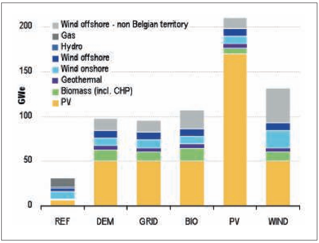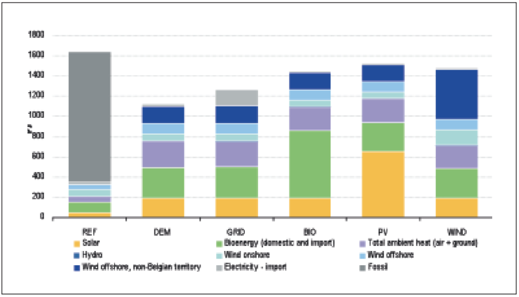La figure ci-contre (haut de page) donne une image de la consommation intérieure brute d’énergie dans les différents scénarios renouvelables. Pour fixer les idées, précisons que la consommation intérieure brute actuelle de la Belgique se situe aux alentours de 2000 PJ (pétajoule). Le scénario DEM implique une sérieuse réduction de la demande d’énergie.