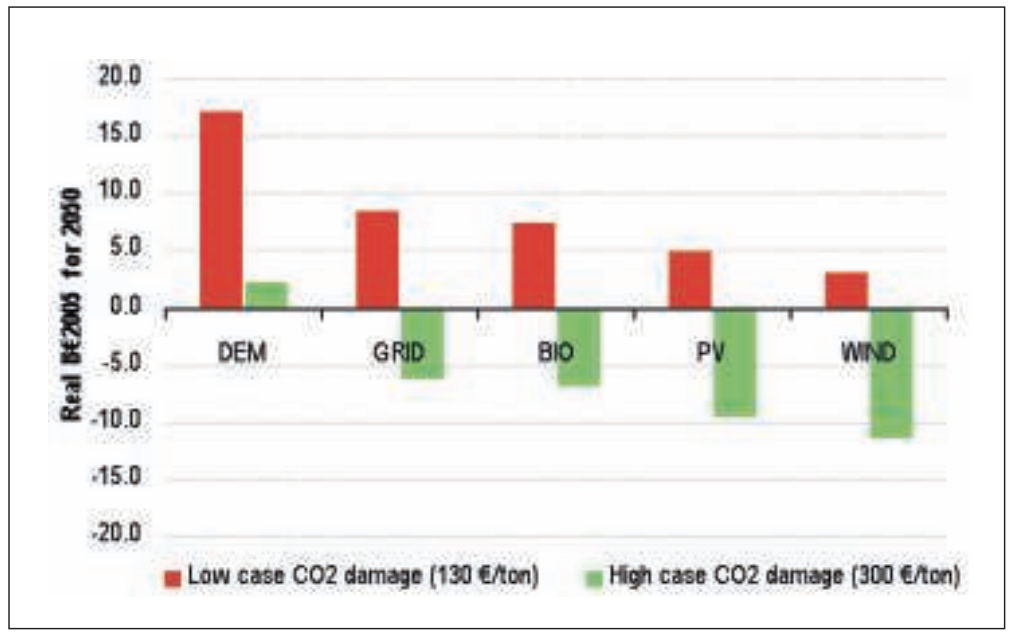 Il faut encore préciser que ces chiffres ne considèrent que les coûts directs liés au système énergétique. Si l’on prend en compte les coûts supplémentaires qui sont liés à la moins bonne disponibilité de l’énergie (rappelons-nous que certaines énergies renouvelables sont par nature fluctuantes) et d’un autre côté les bénéfices liés aux dégâts climatiques évités, la plupart des scénarios présentent un résultat net positif annuel de l’ordre de 10 milliards d’euros, en supposant un coût des dommages climatiques de 300 euros/tonne de CO₂ en 2050 (voir les deux hypothèses reprises dans le graphique ci-dessus).